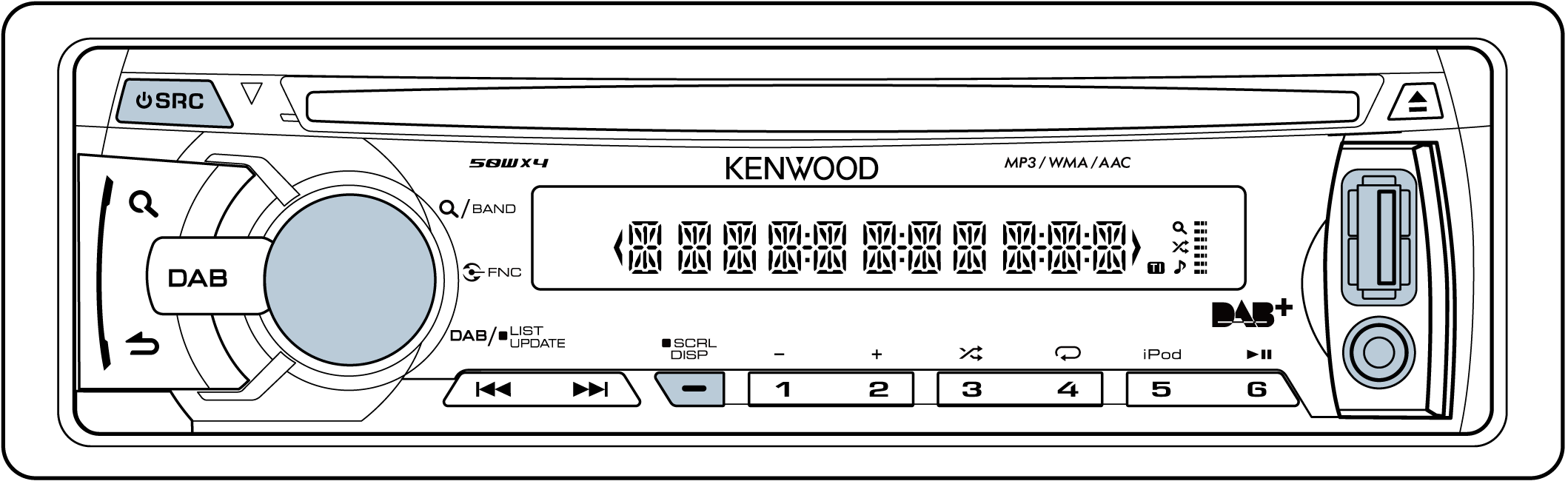 Radio digital ("DAB") Á Radio analógica ("TUNER") Á USB o iPod ("USB" o "iPod") Á CD ("CD") Á Entrada auxiliar ("AUX") Á Modo de espera ("STANDBY")