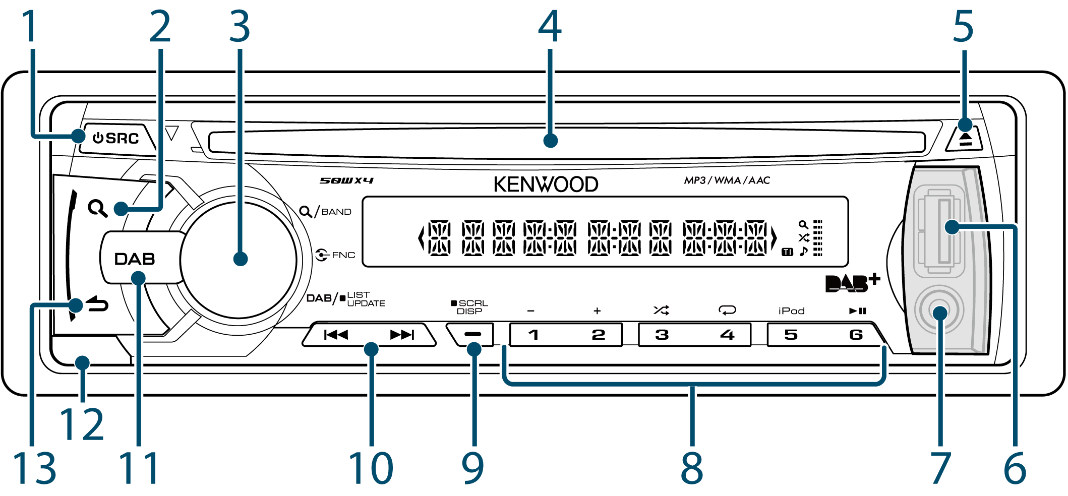 1: Indikerar att någon av funktionerna musiksökning, lista över DAB-tjänster eller PTY-sökning är vald.
