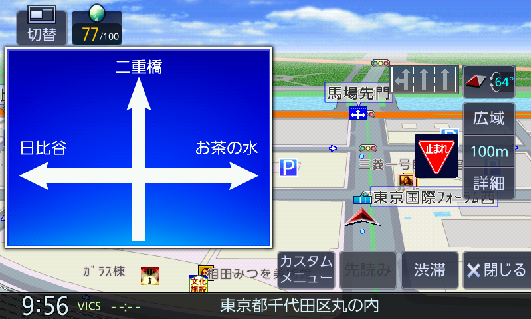 行き先までのルートのほか、方面看板や交差点のレーン情報などをイラストや音声でお知らせします。ルート案内画面について