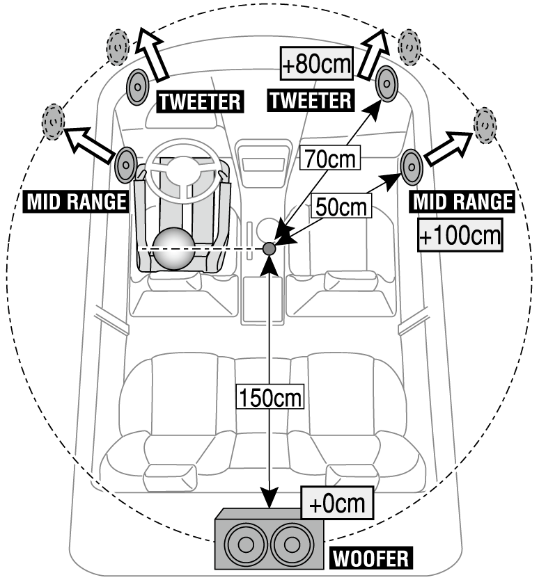 ضبط الموالفة الدقيقة لقيمة تعويض موضع السماعات المحددة في <4-3. تحديد نوع السيارة>.