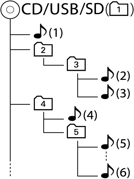 En el ejemplo del árbol de carpetas/archivos que se muestra a continuación, los archivos se reproducen en el orden de (1) a (6).