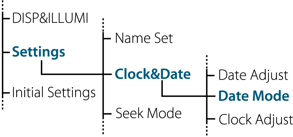 2. Välj "Settings" > "Clock&Date" > "Date Mode" med [Kontrollreglaget].