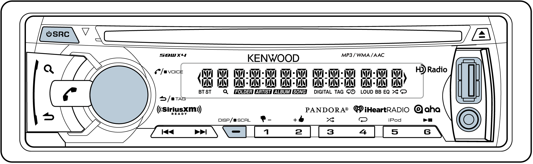 SiriusXM*1 ("SIRIUS XM") Á HD Radio ("HD RADIO") Á USB or iPod*2 ("USB" or "iPod") Á Pandora*3 ("PANDORA") Á iHeartRadio*3 ("IHEARTRADIO") Á Aha*3 ("AHA") Á Bluetooth audio ("BT AUDIO") Á CD*2 ("CD") Á Auxiliary input*3 ("AUX") Á Standby ("STANDBY")
