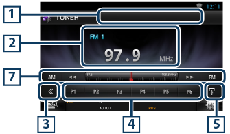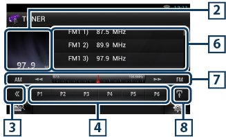 المس لعرض “قائمة الوظائف الفرعية” (7 في هذا الجدول). المس واستمر في اللمس للتنقل بين لائحة المحطات سابقة الضبط ولائحة المعلومات. في طريقة الموالف يظهر نص الراديو المطور (للموديلات ذات كود إقليمي 2 أو 3 فقط). |