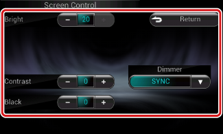 اختيار طريقة ضابط شدة الإضاءة. ON «تشغيل»: يتم خفض شدة إضاءة شاشة العرض والأزرار. OFF «إيقاف»: لا يتم خفض شدة إضاءة شاشة العرض والأزرار. SYNC «مزامنة» (قياسي): يقوم بتشغيل أو إيقاف ضابط شدة الإضاءة عندما يتم تشغيل أو إيقاف مفتاح التحكم في أضواء السيارة. NAV-SYNC «مزامنةملاحة»: يقوم بتشغيل أو إيقاف وظيفة ضابط شدة الإضاءة تبعا لوضع الضبط النهاري/الليلي لوحدة عرض نظام الملاحة. (DNN9350BT/ DNN9350BTM) |