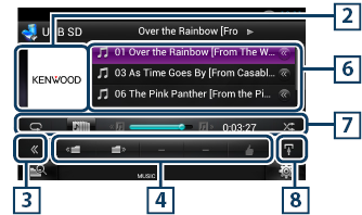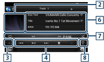 Klepnutím zobrazíte podnabídku funkcí (7 v této tabulce). Klepnutím a podržením prstu se přepíná mezi seznamem skladeb a informací z ID3 tagu (pouze disková média). |