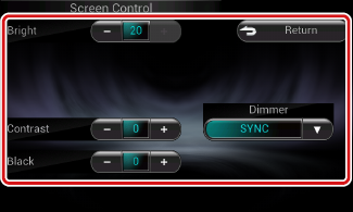 Dimmer-Modus auswählen. ON: Das Display und die Tasten werden abgeblendet. OFF: Das Display und die Tasten werden nicht abgeblendet. SYNC (Werkseinstellung): Die Dimmer-Funktion wird zusammen mit dem Lichtschalter des Fahrzeugs ein- oder ausgeschaltet. NAV-SYNC: Die Dimmer-Funktion wird entsprechend der Tag/Nacht-Anzeigeeinstellung der Navigation ein- oder ausgeschaltet. (DNN9250DAB/ DNN6250DAB) |