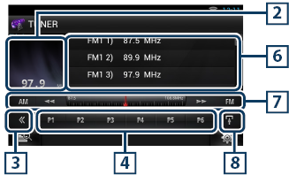 Toque para visualizar el "Menú subfunción" (punto 7 de esta tabla). Toque y mantenga pulsado para cambiar entre la lista de preselección y la lista de información. En el modo de sintonizador se mostrará la información del programa sintonizado. |