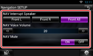Seleccione los altavoces utilizados para guía mediante voz del sistema de navegación. Front L/ Delantero Iz: Utiliza el altavoz delantero izquierdo para guía mediante voz. Front R/ Delantero De: Utiliza el altavoz delantero derecho para guía mediante voz. Front All/ Frontal (predeterminado): Utiliza los dos altavoces delanteros para guía mediante voz. |