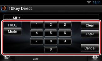 - Para o sintonizador de HD Radio, pode-se procurar por frequência. Sempre que toca em [Mode/Modo] no lado esquerdo da tela, alterna entre o modo de introdução de frequência e o modo de introdução de canal.