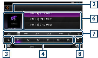 Toque para visualizar el "Menú subfunción" (punto 7 de esta tabla). Toque y mantenga pulsado para cambiar entre la lista de preselección y la lista de información. En el modo de sintonizador de HD Radio, se mostrará la información del programa sintonizado. |