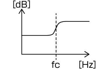 - Passe les signaux dont les fréquences dépassent une certaine fréquence (fc : fréquence de coupure) et atténue les signaux à des fréquences inférieures à la fréquence de coupure. Utilisez ce réglage pour transmettre uniquement les signaux de fréquence élevée. Utilisez cet appareil dans les cas suivants, par exemple :
