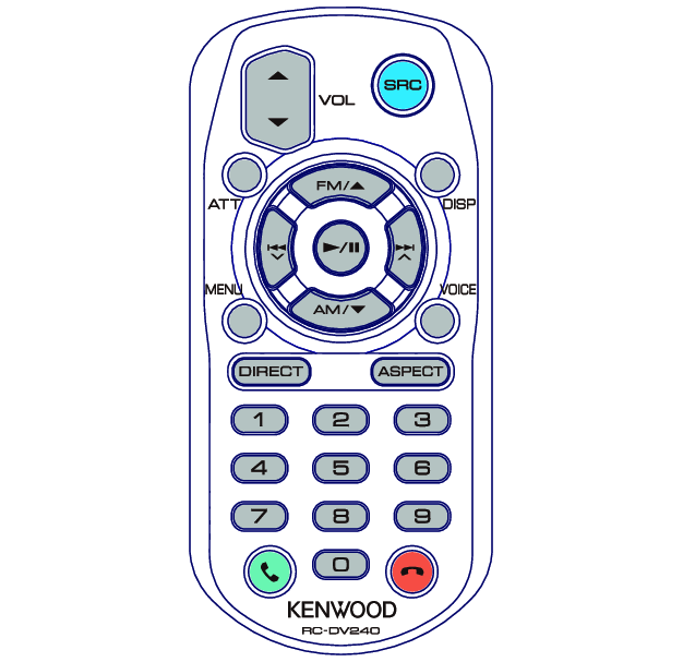 SRC | 切换到将要播放的音频源。 免提模式时,挂断电话。 |