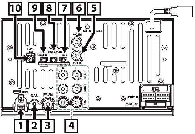 ⑧ | Αυτή η υποδοχή δέχεται είτε είσοδο AV-IN είτε είσοδο κάμερας εμπρόσθιας όψης. Για περισσότερες πληροφορίες, ανατρέξτε στο Ρύθμιση εισόδου. Μίνι βύσμα 3,5 mm 4 πόλων (1: Αριστερός ήχος, 2: Βίντεο, 3: Γείωση, 4: Δεξιός ήχος)
