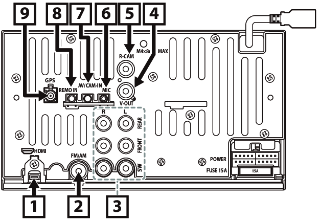③ | When connecting to an external amplifier, connect its ground wire to the car’s chassis to avoid damaging the unit. |