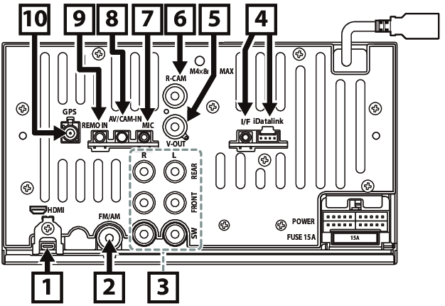 ⑧ | This jack accepts either AV-IN or front view camera input. For more information, see Input Setup. 3.5 mm 4 pole mini plug (1; Left audio, 2; Video, 3; Ground, 4; Right audio)