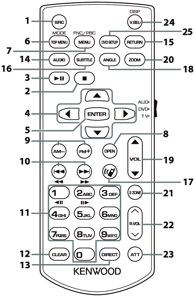9 | AM–/FM+ | AUD | Selects the folder to be played. For the Radio sources in AUD mode, selects FM/AM band to be received. |