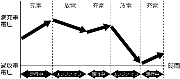 - 本機は車両の電源を常時使用しているため、車両のバッテリーに対して負荷がかかります。長期間車に乗らない場合や短距離の運転を繰り返すと、車載機器の消費電力により徐々にバッテリー電圧が低下してしまいます。(下図)バッテリー上がりを予防するために、こまめに車のエンジンをかけてバッテリー電圧が下がらないように心がけてください。