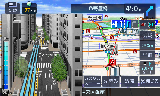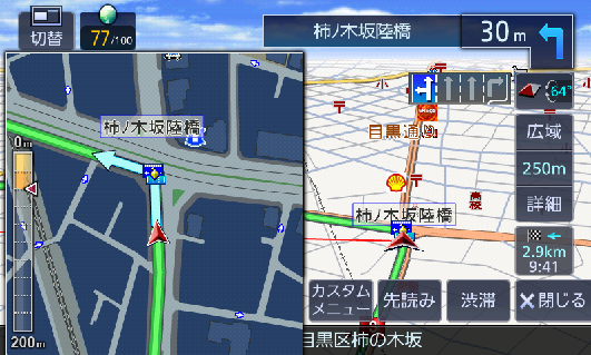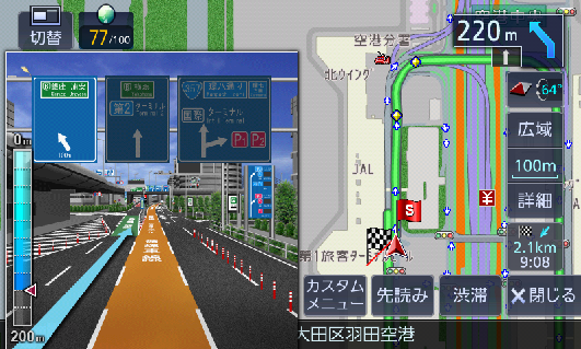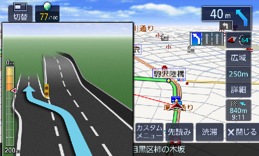 約200m(高速道路は約800m)手前に近づくと表示されます。
