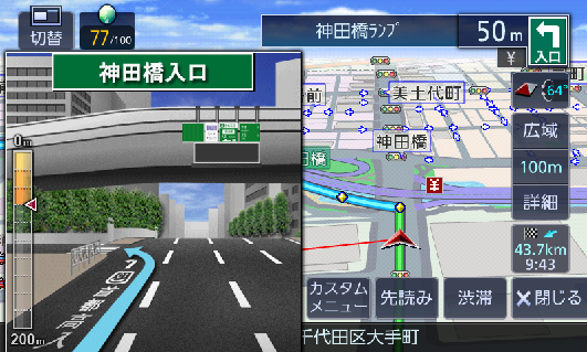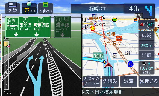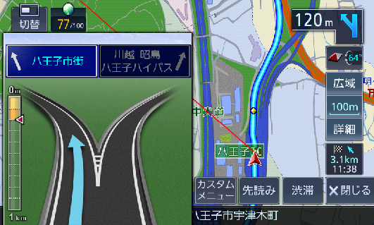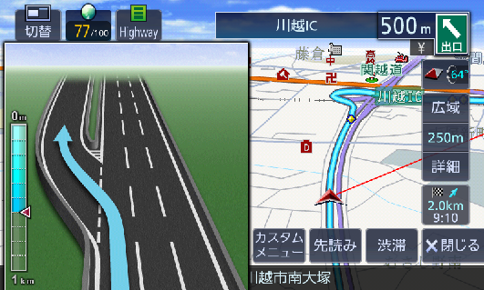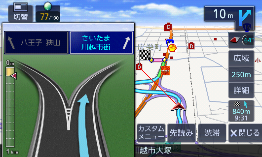 高速道路では、分岐する案内ポイントに近づくと高速道分岐イラストが表示されます。
