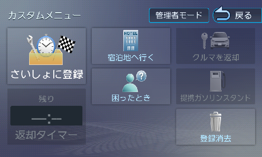 「カスタムメニュー」からレンタカー会社で行う「管理者モード」で、レンタカーの返却場所や提携ガソリンスタンド、緊急連絡先、返却タイマーなどを設定しておくことができます。管理者モードについて