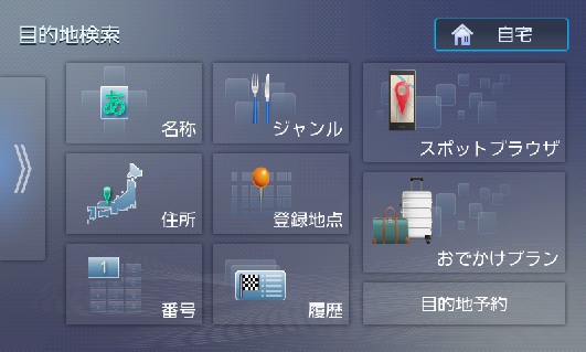 | 目的地検索画面 施設の名称やジャンル、住所など、いろいろな検索方法で行き先を検索できます。行き先を探す