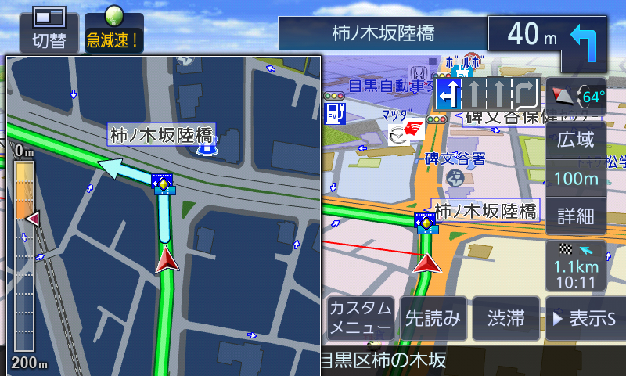 約200m(高速道路は約800m)手前に近づくと表示されます。