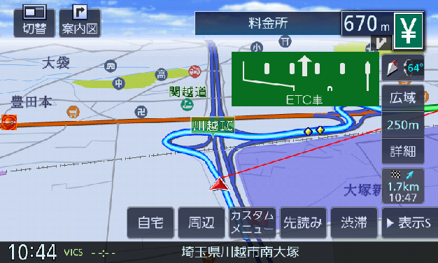ETCレーン表示出口または本線料金所に近づくと、料金所ゲートのETCレーンが表示されます。ETCレーンは、ルート案内していないときにも表示されます。場所によってはETCレーン情報がない場合があります。その場合は表示されません。