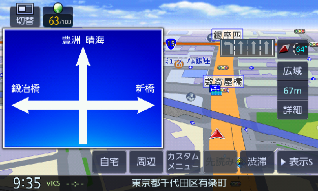 行き先までのルートのほか、方面看板や交差点のレーン情報などをイラストや音声でお知らせします。ルート案内画面について