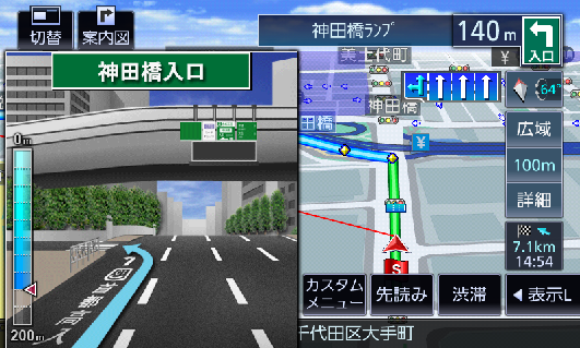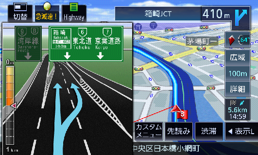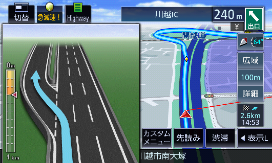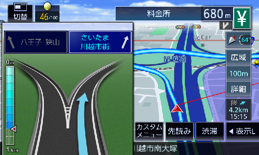高速道路では、分岐する案内ポイントに近づくと高速道分岐イラストが表示されます。