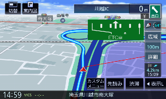 ETCレーン表示出口または本線料金所に近づくと、料金所ゲートのETCレーンが表示されます。ETCレーンは、ルート案内していないときにも表示されます。場所によってはETCレーン情報がない場合があります。その場合は表示されません。